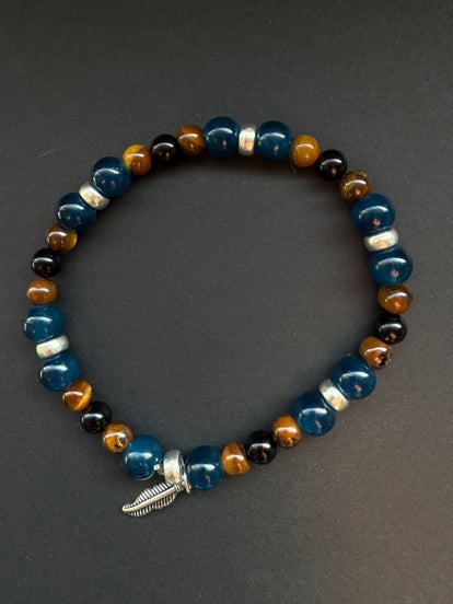 Dit stoere armbandje is gemaakt van lapis lazuli (wijsheid & zelfvertrouwen), tijgeroog (kracht & focus) en zwarte onyx (bescherming & balans). De combinatie van diepe blauwtinten, warme bruinen en zwart maakt dit sieraad krachtig én stijlvol.